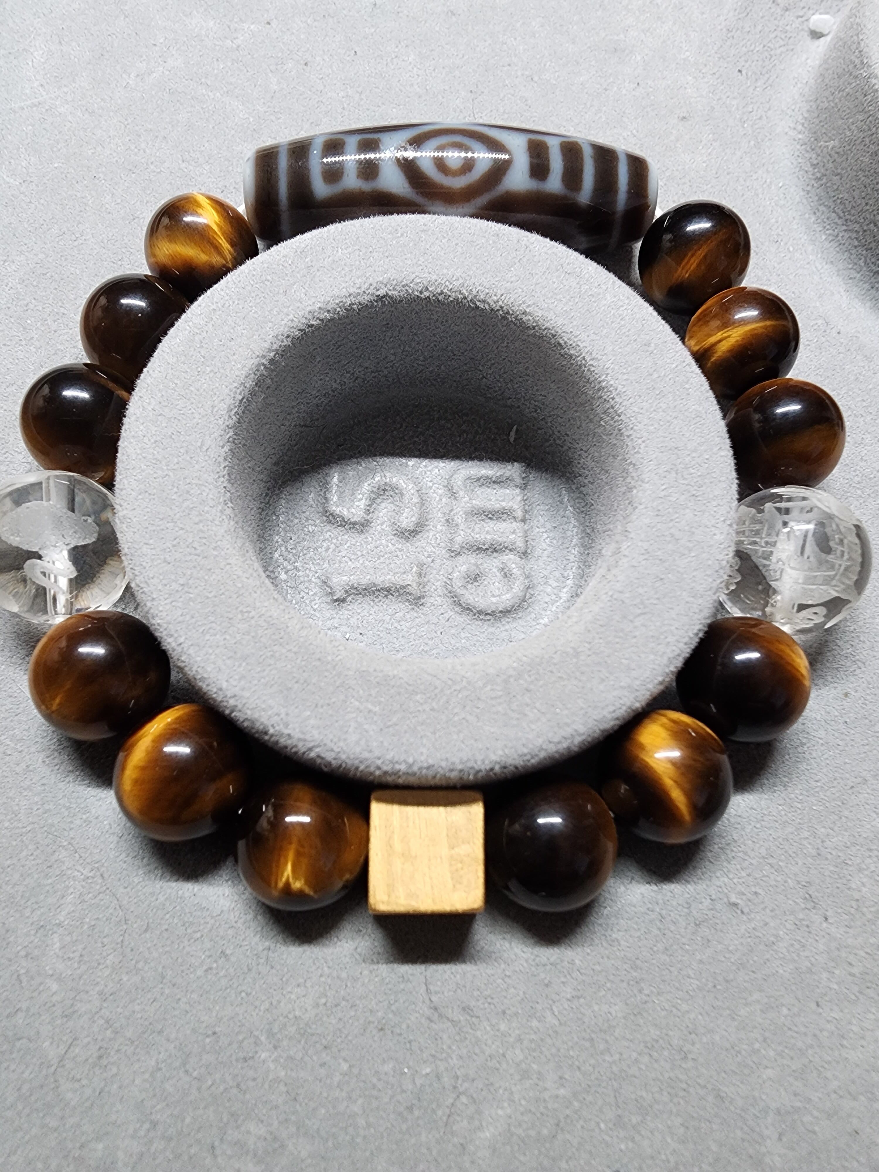 構成:天珠32ミリ、タイガーアイ10ミリ×12個、龍彫り水晶12ミリ×2個、ムオニオナルスタ8ミリ。