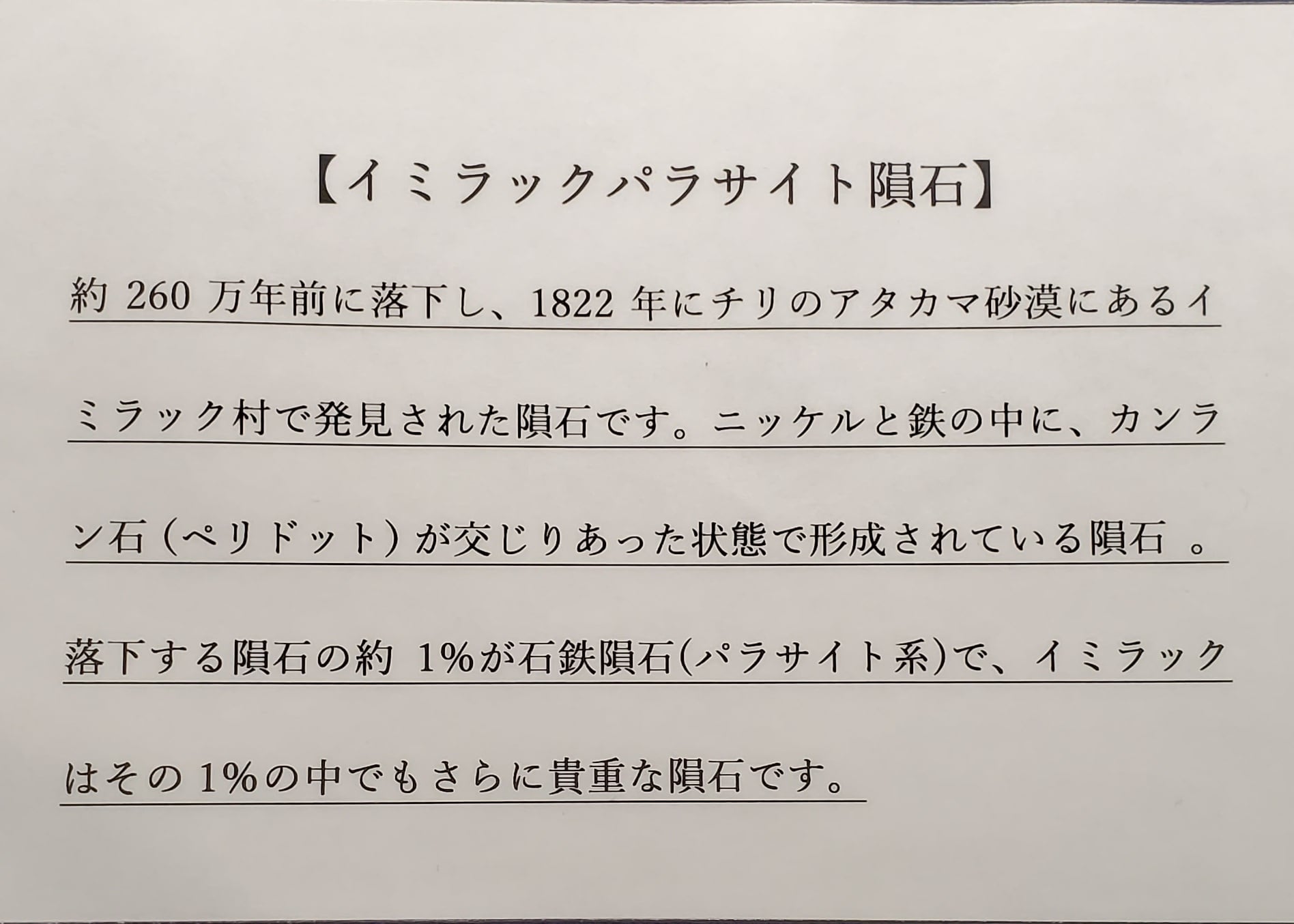 イミラックはパラサイト系の隕石の中でもさらに貴重なもので、錆びにくいのも特徴です。
